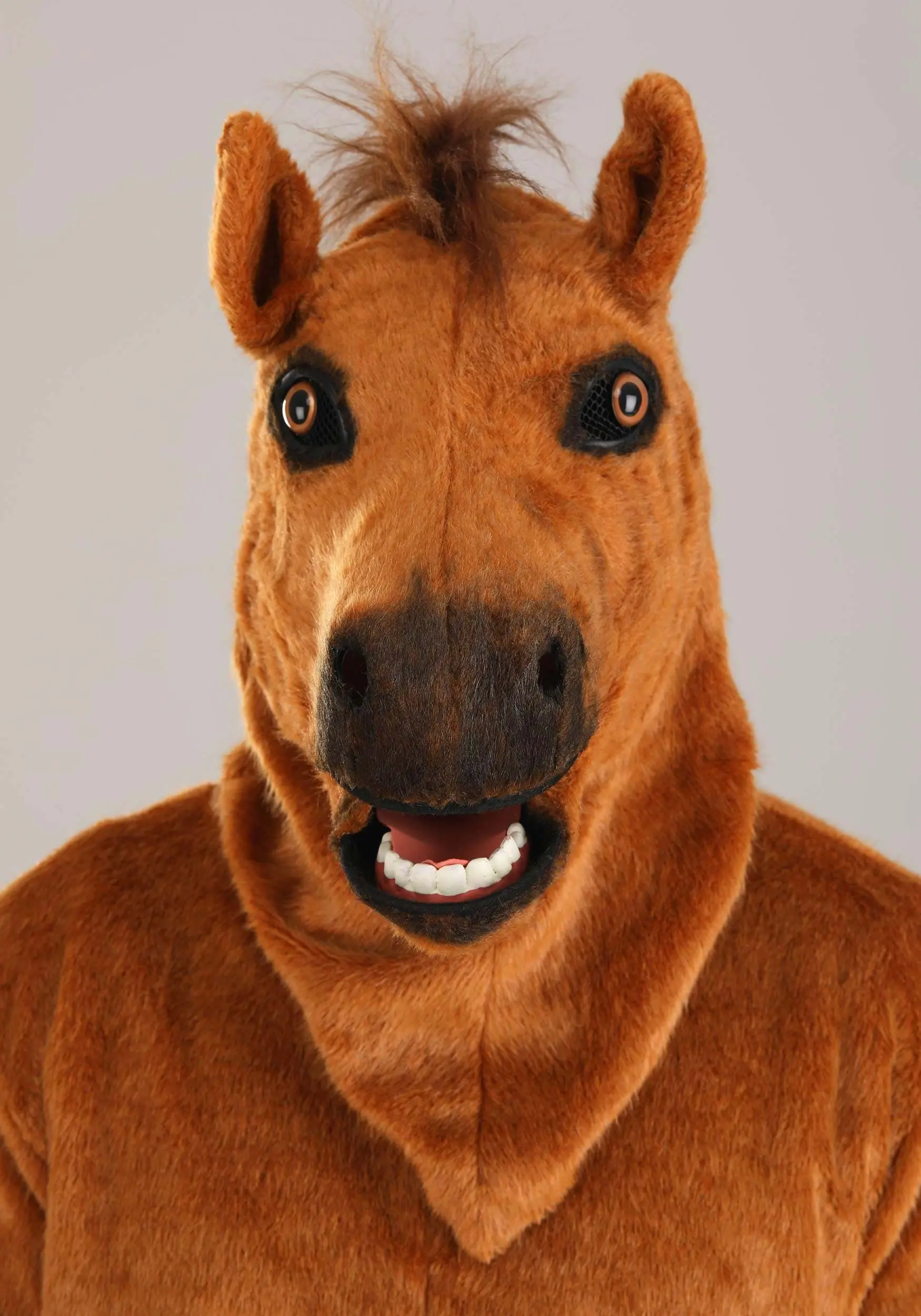 When you feel like the animal inside you is ready to burst free, what better way is there to release it than with this Horse Mouth Mover Costume? This “Made By Us” costume was put together by our hard working and careful artisans, so you will feel good about wearing this for years to come. The jumpsuit has the majestic colors and wonderful style that would net you first prize in any animal show! The hood/mask has an articulating mouth–it’s a great way to show your friends that you are more than just some beast. Looking great and feeling awesome has never been easier!
