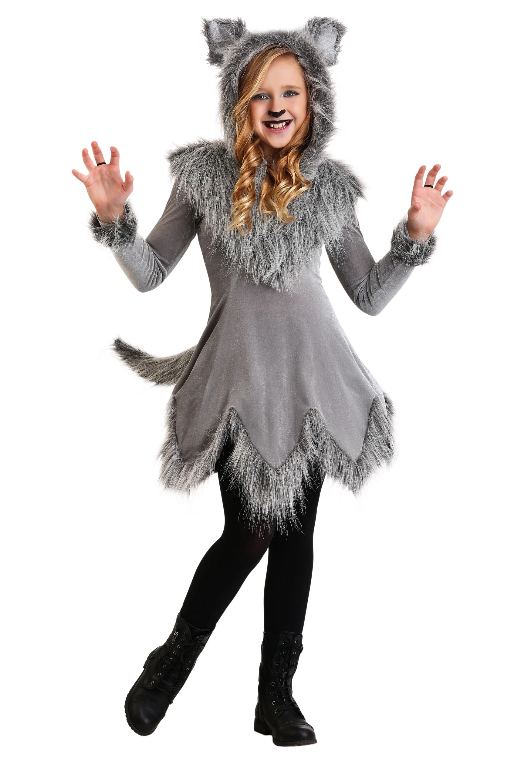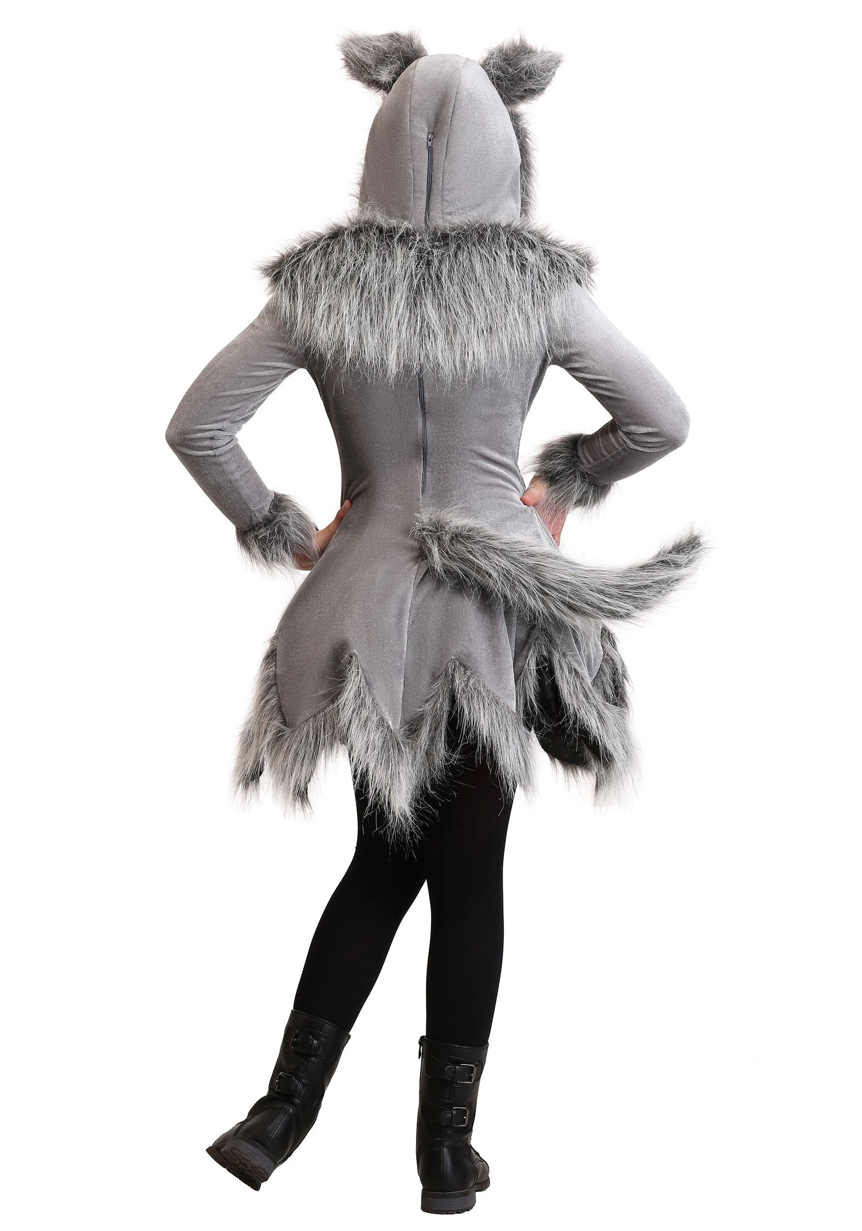 This wolf costume is the perfect way to frame those fairytale wolves in a soft new perspective. The high-quality of the Made by Us design allows your child to wear this costume for events as well as dressing up for playtime. The gray tunic falls past the hip in a wild pointed hemline. Trimmed in natural-looking faux fur around the hem as well as the shoulders, this costume looks right at home in the woods. A long tail is attached to the back, making posing in this costume extra fun. The hood is topped with furry ears for an instant ferocious look. The costume zips up the back to make transforming into a wolf, easy-peasy.Â