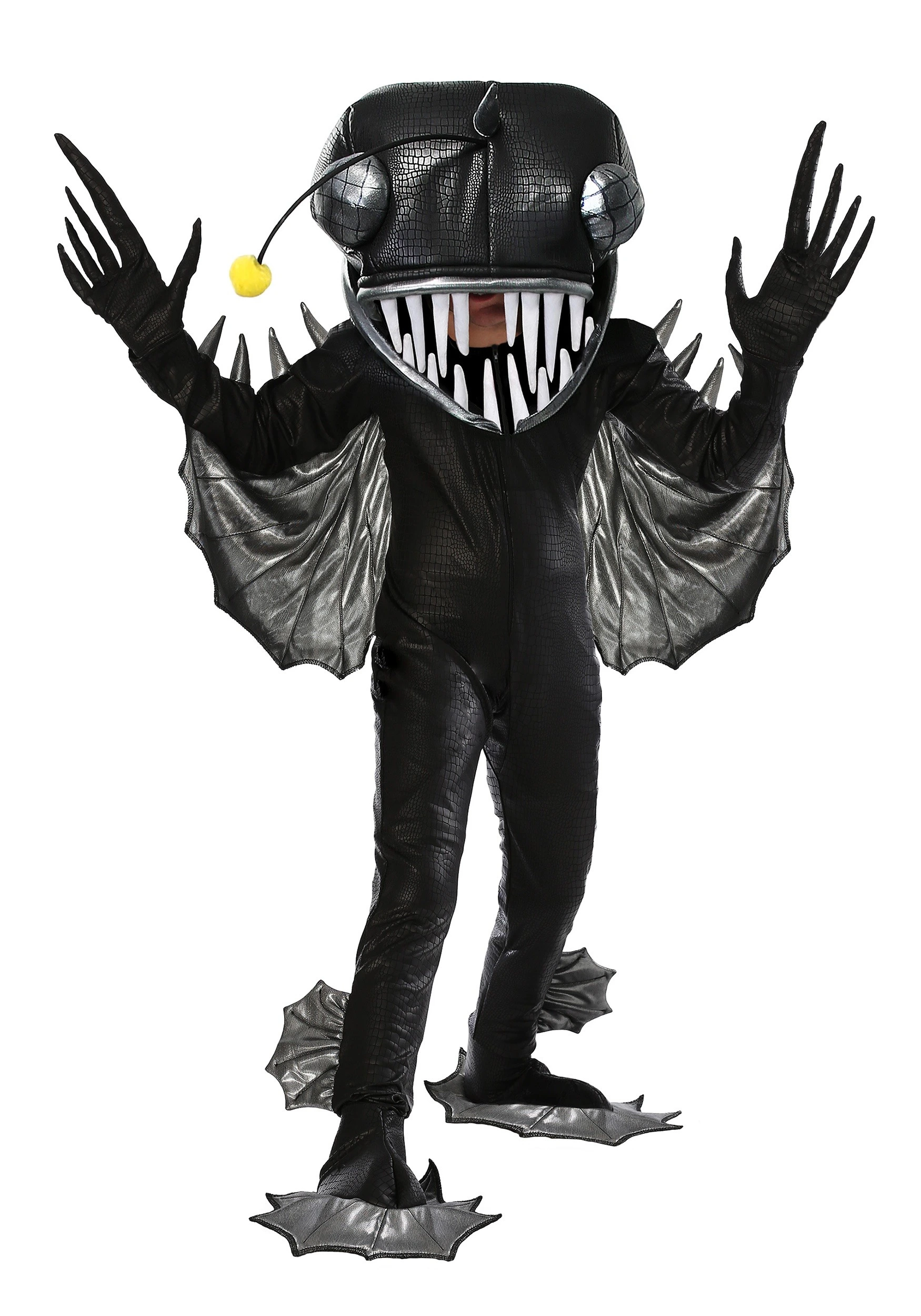 Any kid who wants to dress up as a real-life monster this Halloween will absolutely love this ensemble. The jumpsuit looks like it has emerged from the deep with silver fins, long fin-like fingers, and spikes on the arms. Top it off with the toothy hood with its large eyes and enticing dangling ball and your kiddo is sure to emerge this Halloween ready to show us land dwellers the weird and wonderful stuff we’ve been missing below!