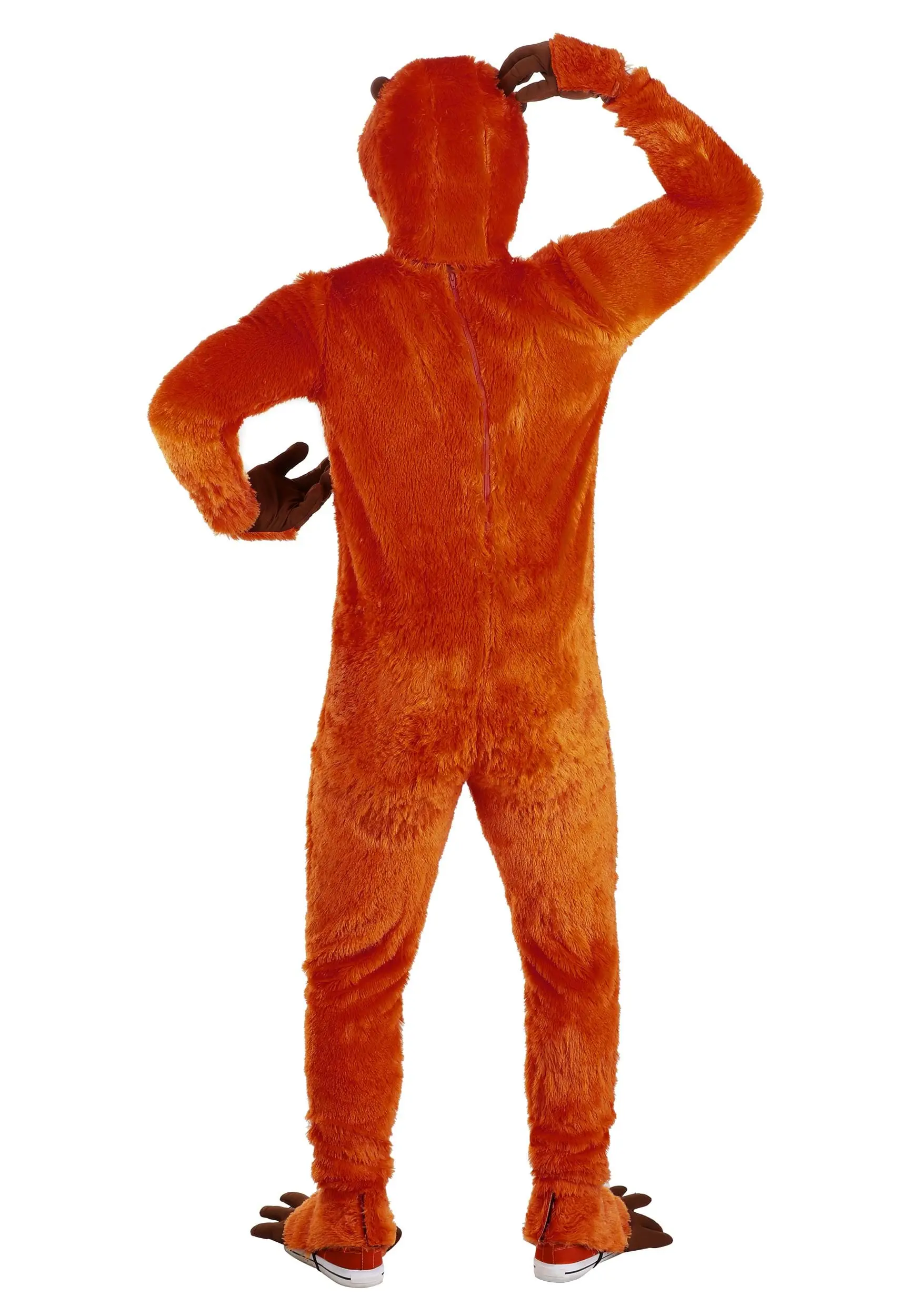 Monkeying around is your specialty when you’re wearing this Orange Orangutan Costume for Adults! The jumpsuit zips up the back and is made of burnt orange polyester faux fur that’s super soft and comfy. The torso is appliqued with a brown belly patch complete with an embroidered navel. Wrist-length gloves hide your human hands and the attached shoe covers secure under each foot with an elastic band. The foam-backed hood fastens under your chin and is decorated with a soft-sculpted muzzle, ears, and plastic eyes.Â