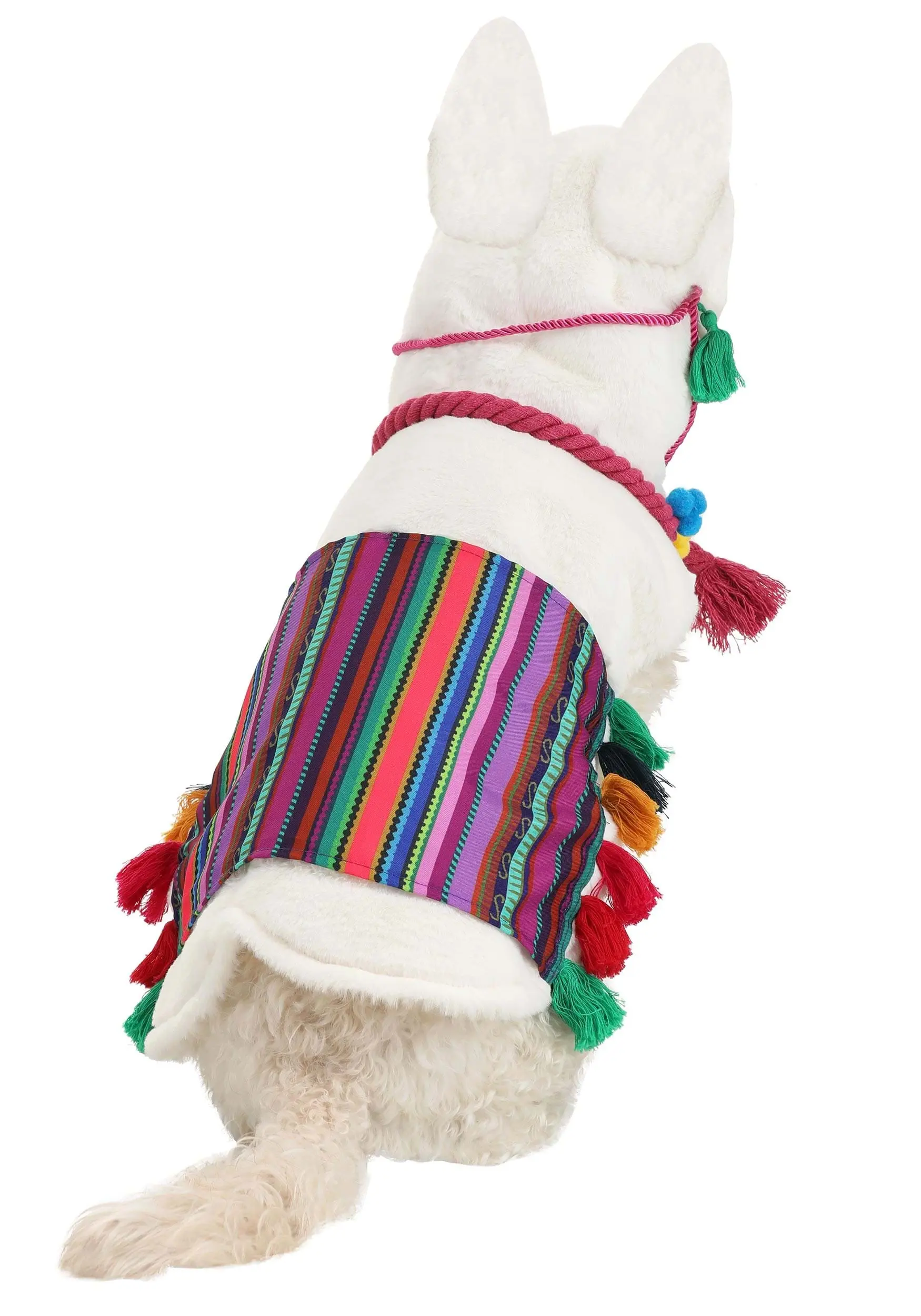 Your dog will look larger than life in this exclusive Llama Costume for Dogs! The outfit fastens along the front of the chest and is made of soft white short pile faux fur. A slit at the back of the neck allows access to the collar in the event that you want to attach a leash. The outfit is decorated with brightly patterned poplin “saddle cloth” edged with red, green, yellow, orange, and blue tassels. The hood features attached upright llama ears made of fabric-lined faux fur.Â